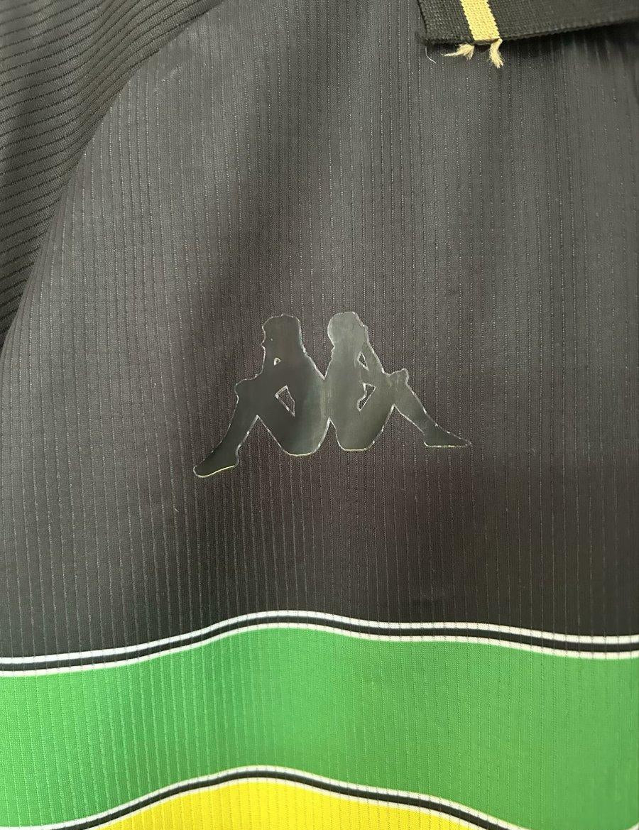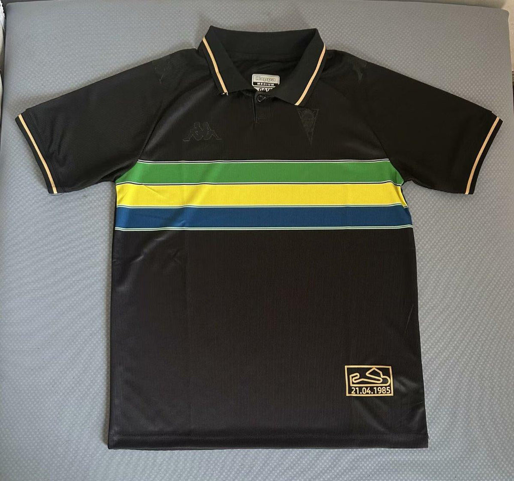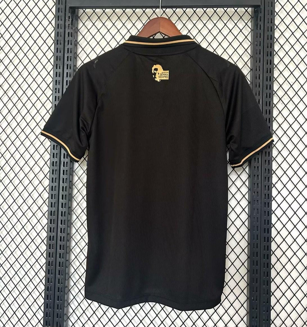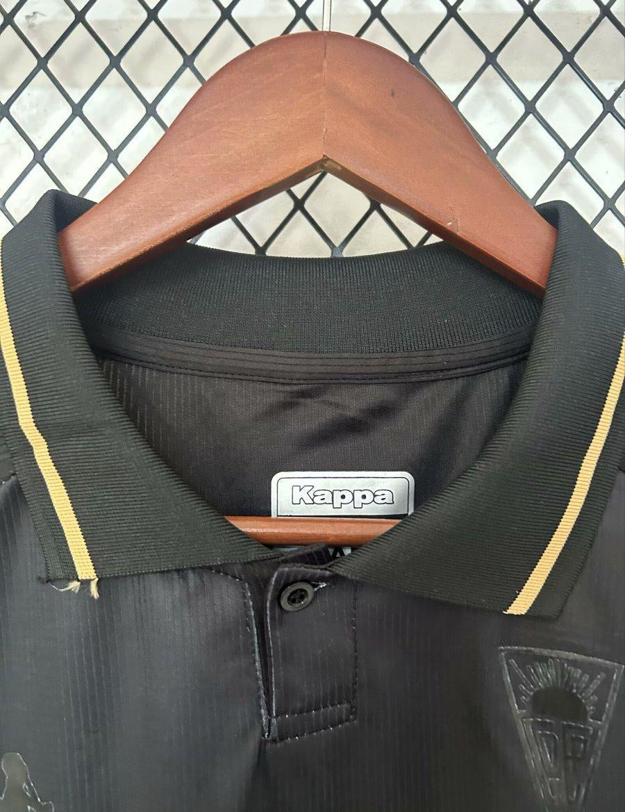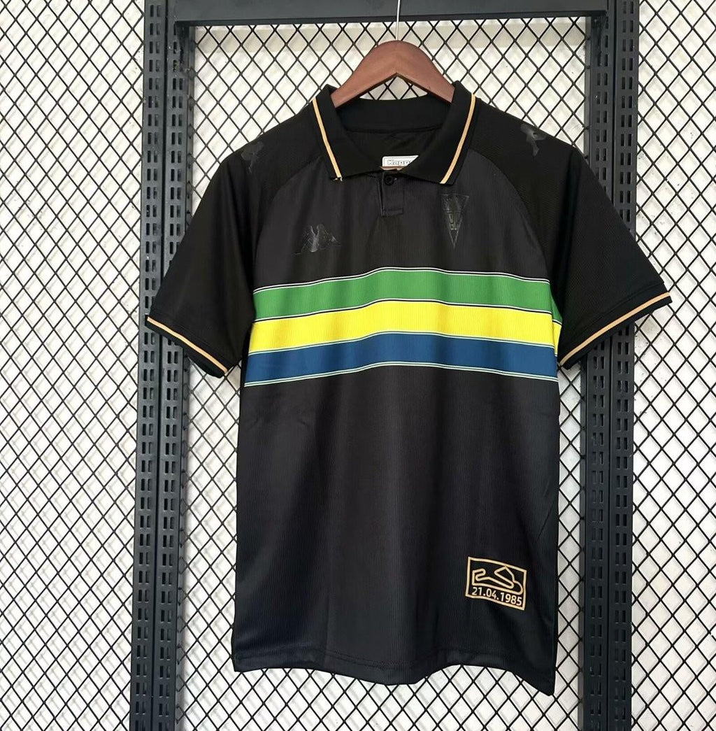 Em preto elegante, com gola polo preta e friso amarelo, a camisola destaca-se pelas faixas em amarelo, verde e azul, representando com orgulho as cores da bandeira brasileira. O escudo do Estoril Praia aparece em estilo blackout, assim como o logótipo da Kappa, criando um visual moderno e sofisticado.