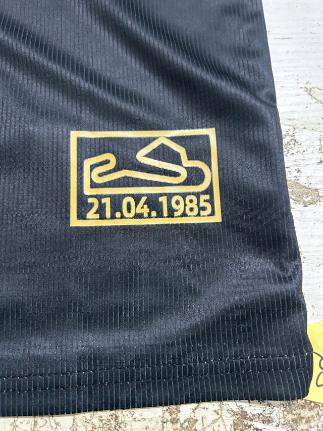 Na parte inferior esquerda, encontra-se a silhueta do circuito do Estoril com a data 21.04.1985, relembrando o histórico triunfo de Senna. Nas costas, a frase “Ayrton Senna Sempre” em amarelo, com a silhueta do piloto, reforça esta peça como um tributo emocionante.
